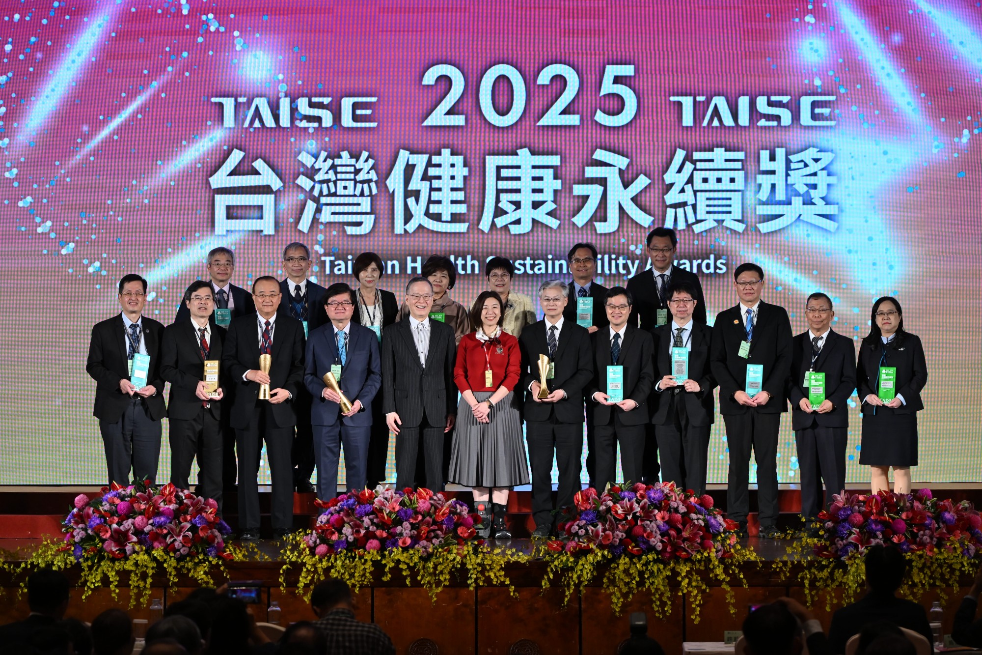 TAISE董事長簡又新大使(前左五)、衛福部次長林靜儀(前右七),與醫院受獎代表合影。(TAISE提供)