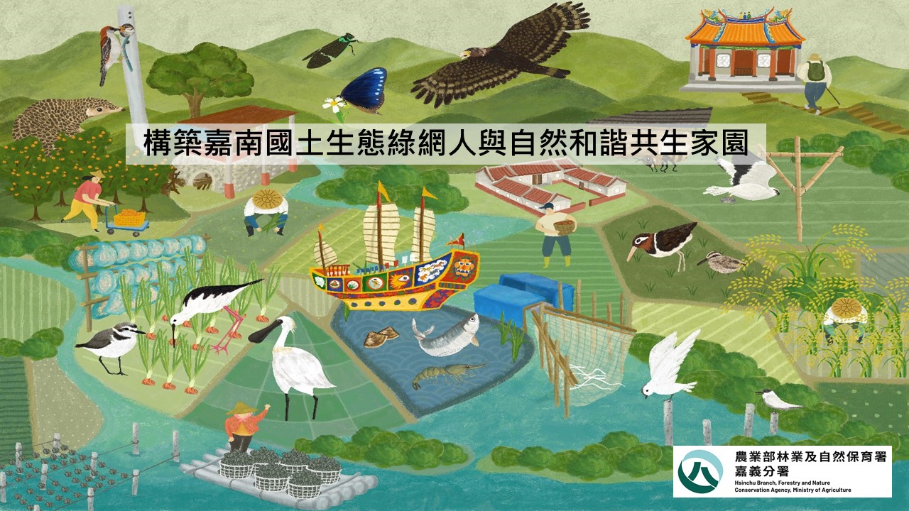 林業及自然保育署嘉義分署以「永續林業、生態台灣」作為願景,近年積極投入嘉南地區國土生態保育綠色網路計畫,以空間尺度規劃嘉南地區生物多樣性保育策略,在6條區域保育軸帶內,指認重點關注區域及關注物種,積極執行保育行動,並建立跨單位合作平台,偕同推動生態系復育與棲地串聯。於物種保育層面,率先推動山麻雀及諸羅樹蛙等瀕危物種生態給付示範計畫,進行宜居棲地營造並結合社區巡守及友善耕作;於地景空間尺度,藉公私協力串聯嘉南地區廢曬鹽田,營造候鳥友善棲地。91年起輔導60個社區執行「社區林業計畫」,展現社區多元特色、兼顧生計與在地居民建立良好夥伴關係,實踐里山精神。自95年與阿里山鄉鄒族建立資源共管平台,107年更與嘉義縣鄒族獵人協會合作推動狩獵自主管理計畫,獵人遵守「狩獵自治自律公約(einu)」,透過現代化的科學監測與培力,促進部落族人傳統狩獵文化知能傳承,了解狩獵與野生動物族群間動態平衡及明智利用情形,實踐「紮根傳統文化,立足現代管理」概念。嘉義分署推動各項自然保育工作,積極呼應昆明-蒙特婁全球生物多樣性框架(KM-GBF)的行動目標,兼顧在地社區與權益關係人需求,營造「人與自然和諧共生」的家園。