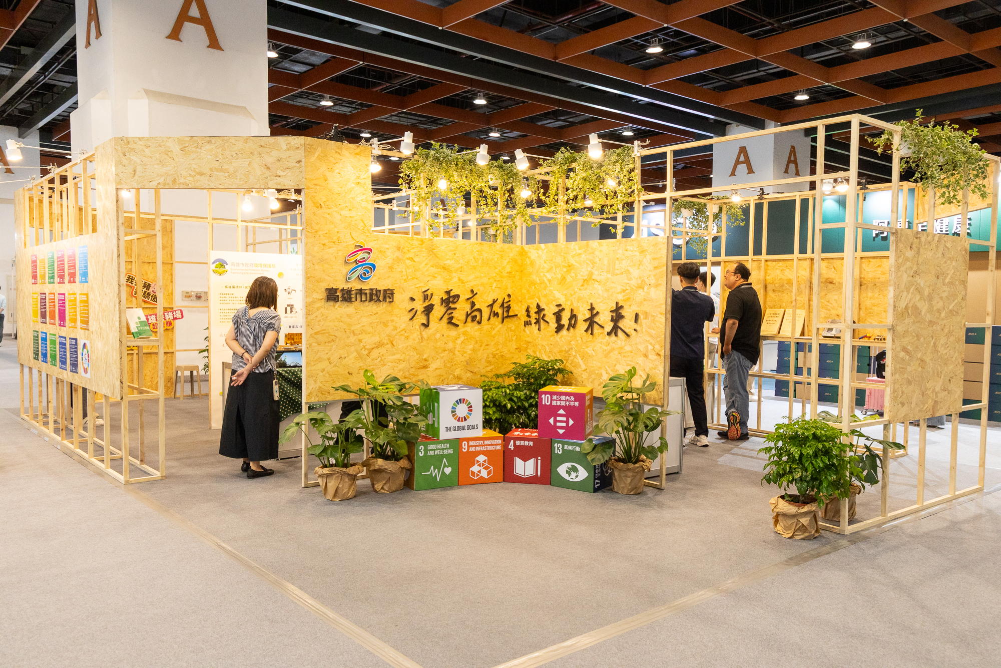高雄市政府以「從教育到生活」為核心,規劃四大主題,涵蓋淨零永續政策推動與成果、綠領人才培育與永續校園及環境教育、低碳交通、資源循環再利用,全面呈現高雄實踐永續城市的行動力與政策成果。展出內容對應SDGs,展現高雄在淨零轉型與永續治理上的政策與成果,透過地圖式導覽設計,引導民眾在日常中實踐的永續行動。 全國首座公部門實體淨零學院,攜手五大國際查驗機構推動ISO碳管理證照,開設通識與技術課程、實廠交流、國際論壇與工作坊,榮獲113年國家永續發展獎。校園面向則以SDGs為主軸,推動永續校園、氣候行動與能源教育等,並設立「環教綠星獎」制度,鼓勵學生實作參與,深化青年倡議與行動力。從教育與日常行為出發,倡導低碳小旅行與綠色生活圈,鼓勵搭乘大眾運輸,推動電動公車與渡輪,結合AIoT號誌控制、智慧停車等,透過視覺化平台,呈現道路績效、停車供需、公共運輸與共享運具,打造高效率且友善的智慧交通網絡。 以零廢棄、全循環為目標,設置全國最大公有底渣處理廠,推動焚化底渣再生,再生粒料使用量全國第一,推廣廢家具再造、綠色工藝。輔導畜牧沼氣利用,並成功輔導畜牧業取得綠電憑證、碳足跡與減碳標章,落實資源永續與淨零目標。