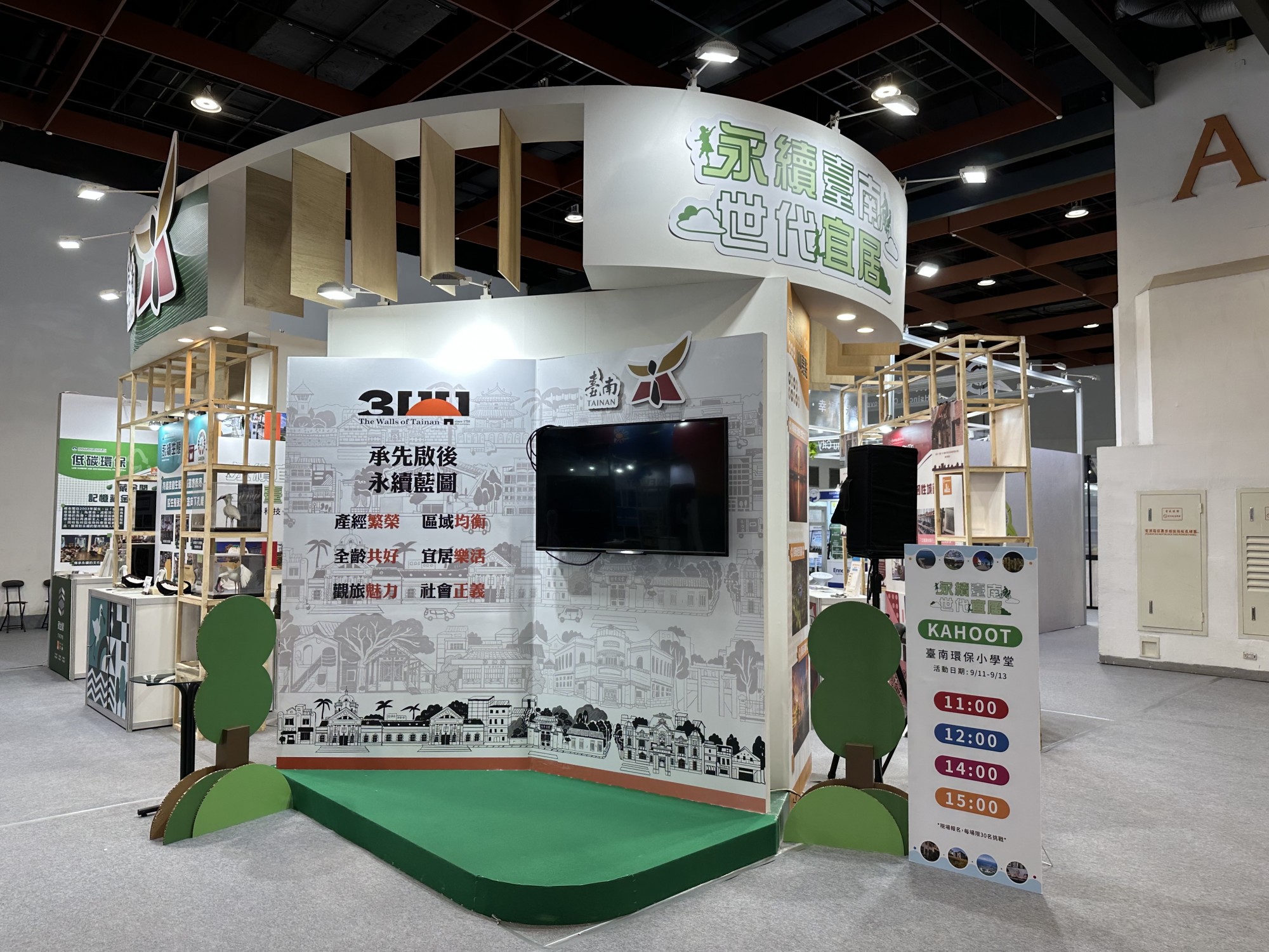 臺南市政府以「永續臺南 世代宜居」為主題,以文化、旅遊、生態、環保、健康與照護等六大主題,呈現城市在各領域的創新與努力,展現出府城深厚的人文底蘊與永續發展能量。在文化面向,文化局以「府城城垣300年」為策展主軸,重現臺南悠久的歷史記憶與文化積澱,並強調城鎮韌性的重要價值,展現城市在傳統與現代間的永續延續。觀光旅遊局則以老屋新生為亮點,讓老建築轉化為特色民宿,不僅舒緩旅宿需求,更吸引青年返鄉創業,帶動地方觀光與經濟發展。農業局展區以生態保育為核心,呼籲人與自然和諧共生,展現臺南守護生態多樣性的行動成果。環保局則以「藏金閣」為主題,展示廢棄家具重生、環保美學作品及二手檜木小物,傳遞資源循環再利用與綠色生活美學。社會局則呈現臺南如何建構完善的社會安全網,守護民眾安全與福祉。衛生局展區則推動無菸環境政策,積極阻絕新型菸品與電子煙威脅,透過稽查與宣導雙管齊下,提升整體居住品質。