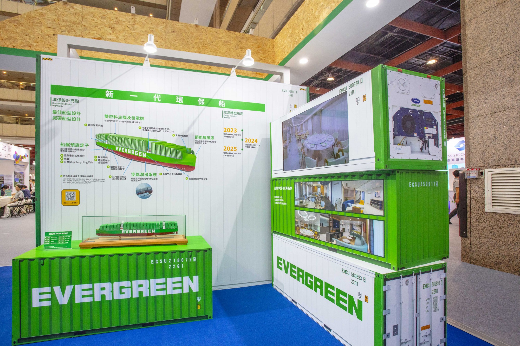 長榮海運以「綠色航運,永續未來」為主題,介紹公司在節能減碳、生態保護和照顧船員方面的努力與成果。
