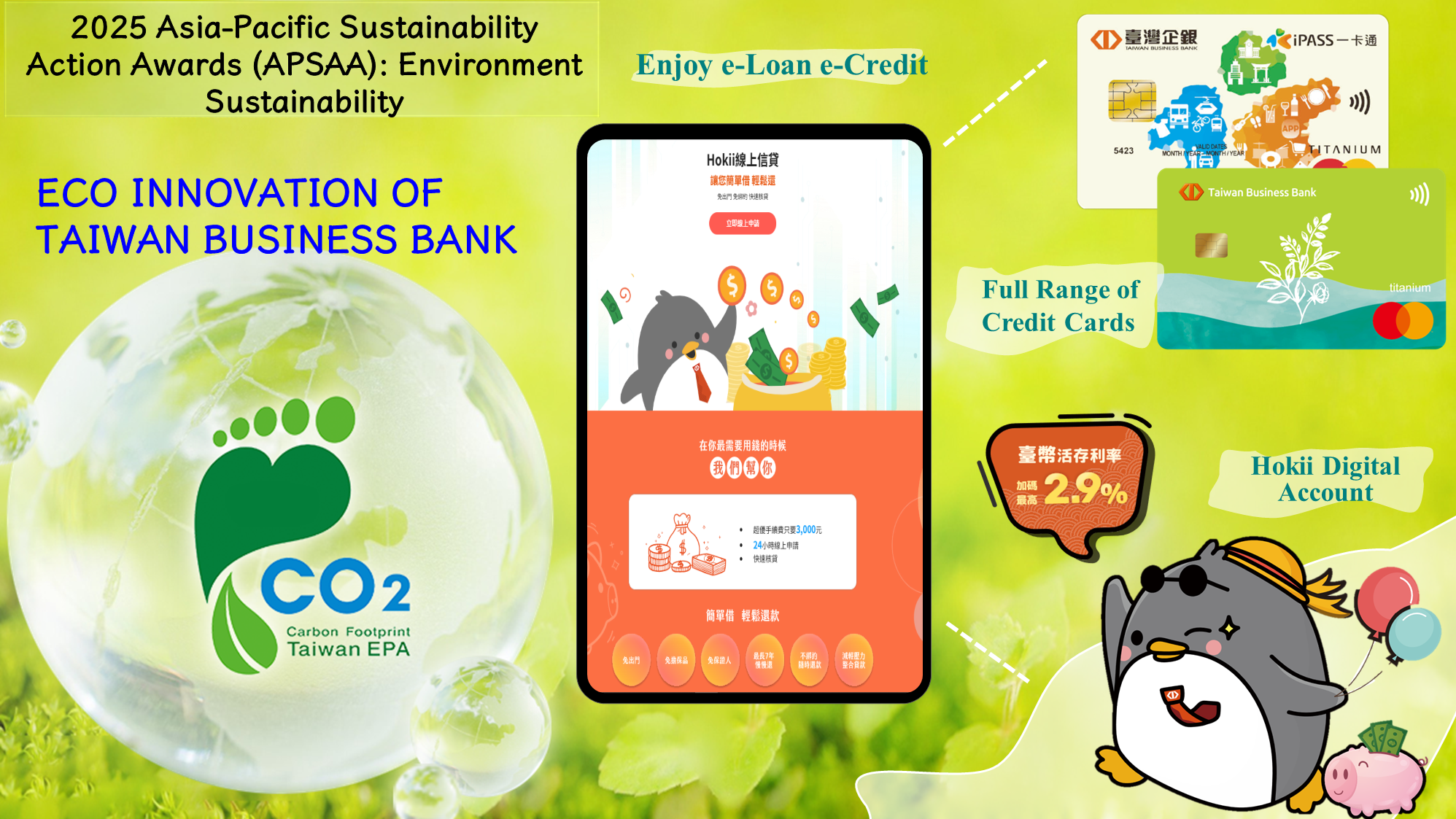 Taiwan Business Bank promotes sustainable finance by integrating ESG concepts into digital services such as account opening, financing, and credit cards, forming the “ECO Finance Digital Financial Ecosystem.” In 2024, the bank adopted international carbon footprint verification standards, assessing emissions across the financial service lifecycle—online applications, account reviews, service delivery, and waste disposal—implementing rigorous carbon management.