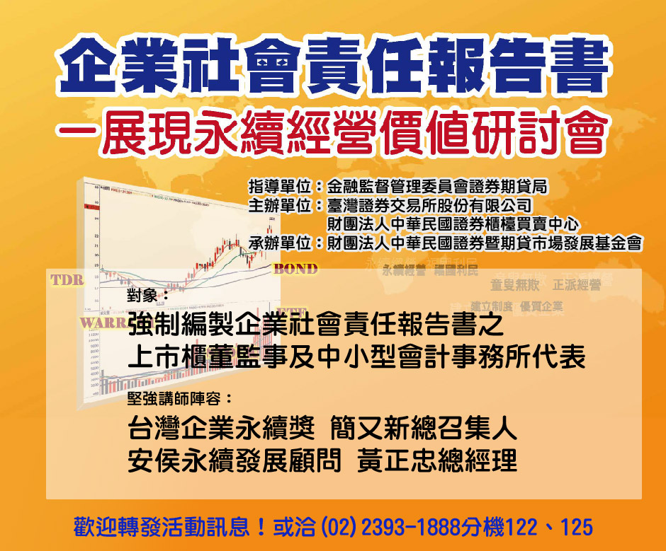 為配合金管會推動相關政策並落實公司治理藍圖循序推動編製企業社會責任報告書之規劃,協助上市(櫃)企業董事(含獨立董事或監察人)了解企業社會責任報告書編製內容與其效益,臺灣證券交易所暨證券櫃檯買賣中心特委託證基會辦理:「企業社會責任報告書-展現永續經營價值研討會」,本研討會將邀請社會賢達與各上市(櫃)企業董事(含獨立董事或監察人)代表經驗分享與交流。
