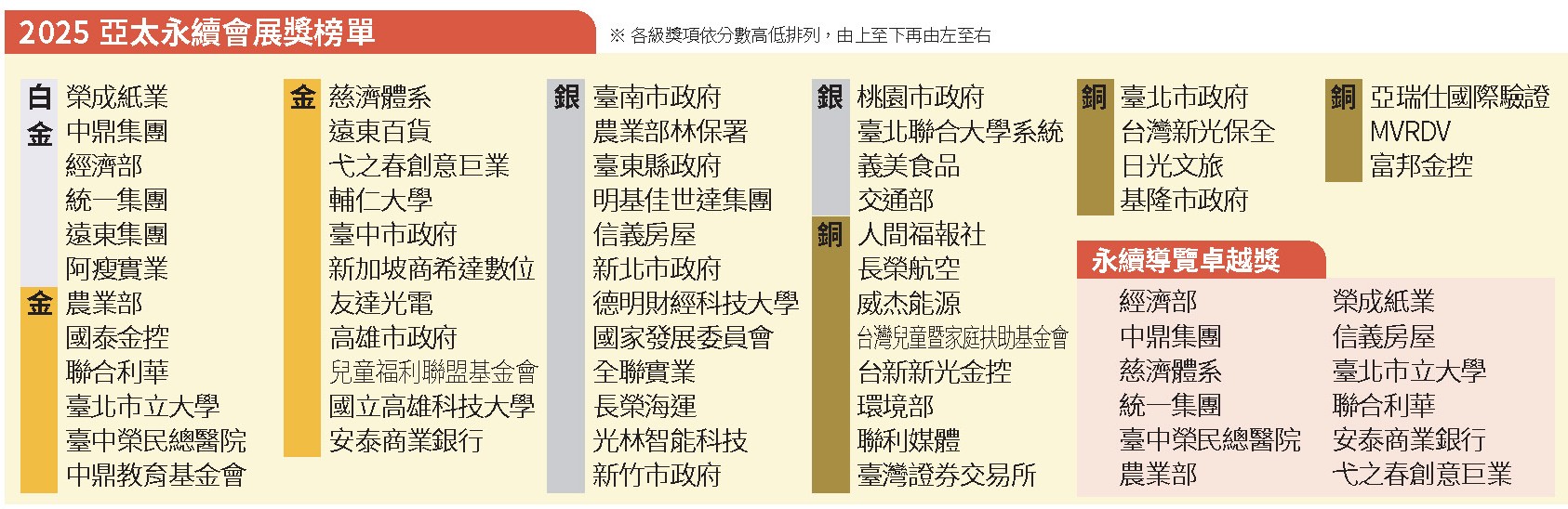 2025亞太永續會展獎揭曉!榮成紙業、中鼎集團、經濟部、統一集團、遠東集團與阿瘦實業勇奪最高白金榮譽,評審團肯定所有獲獎單位落實低碳設計,並發揮創意推廣永續理念的努力,期許藉由評選結果帶動整體會展產業轉型,激勵更多組織深化永續行動。