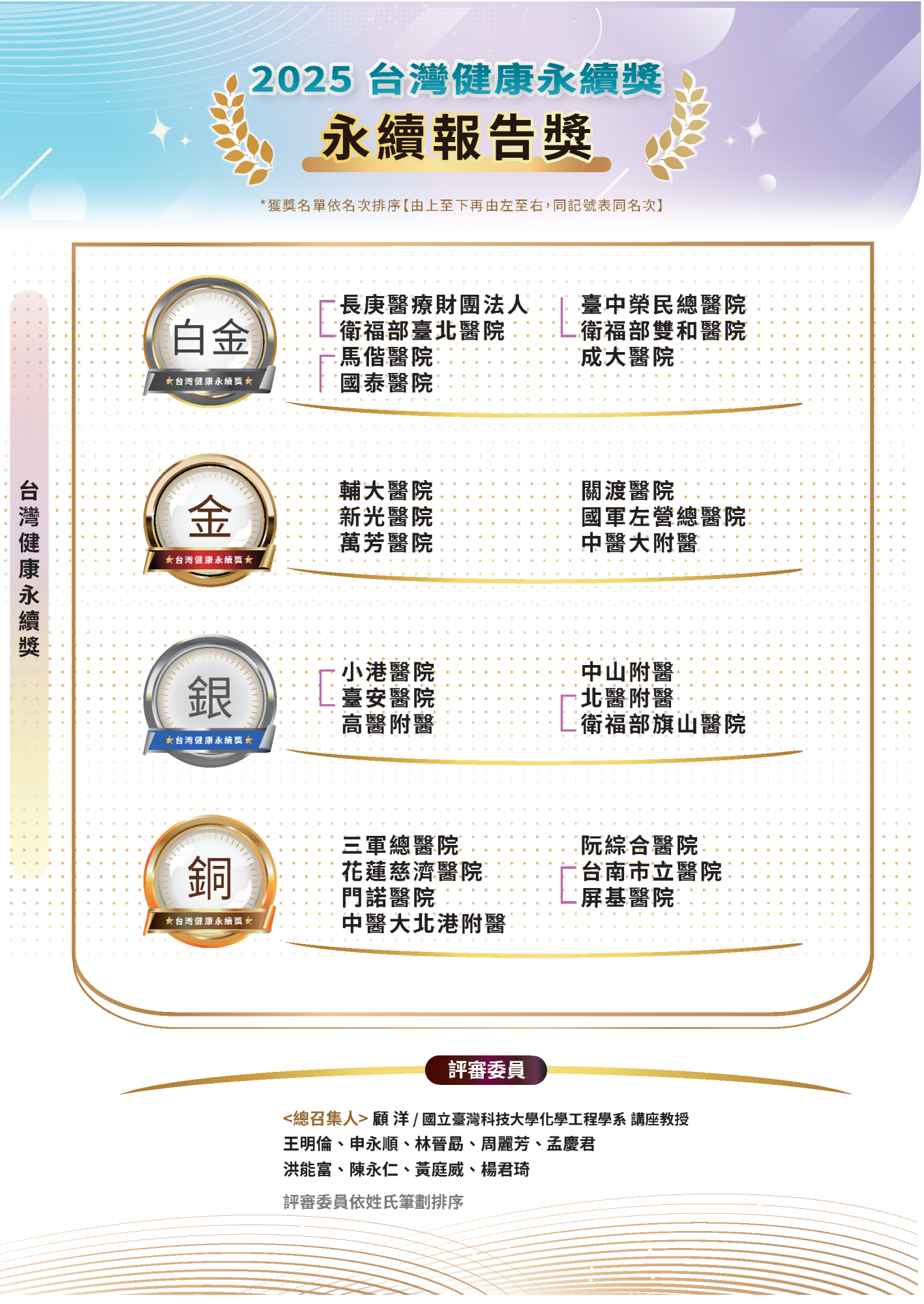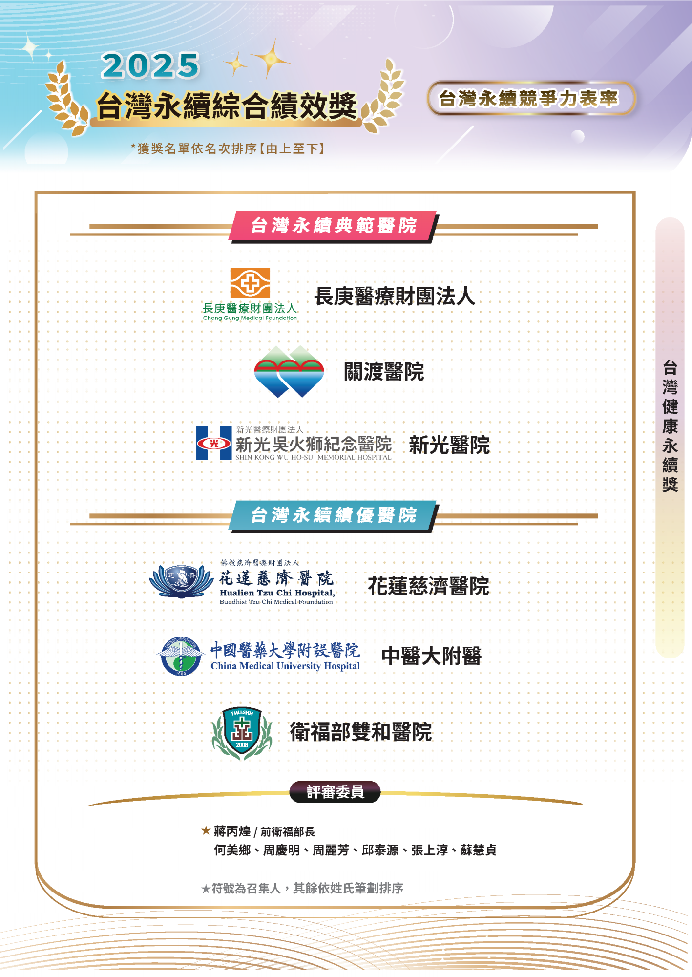 運用正向鼓勵力量,鼓勵各醫療院所落實健康永續議題並發揮影響力,台灣永續能源研究基金會(TAISE)主辦「2025台灣健康永續獎」,由長庚醫療財團法人、臺北市立關渡醫院(委託臺北榮民總醫院經營)、以及新光吳火獅紀念醫院獲得綜合績效典範醫院。