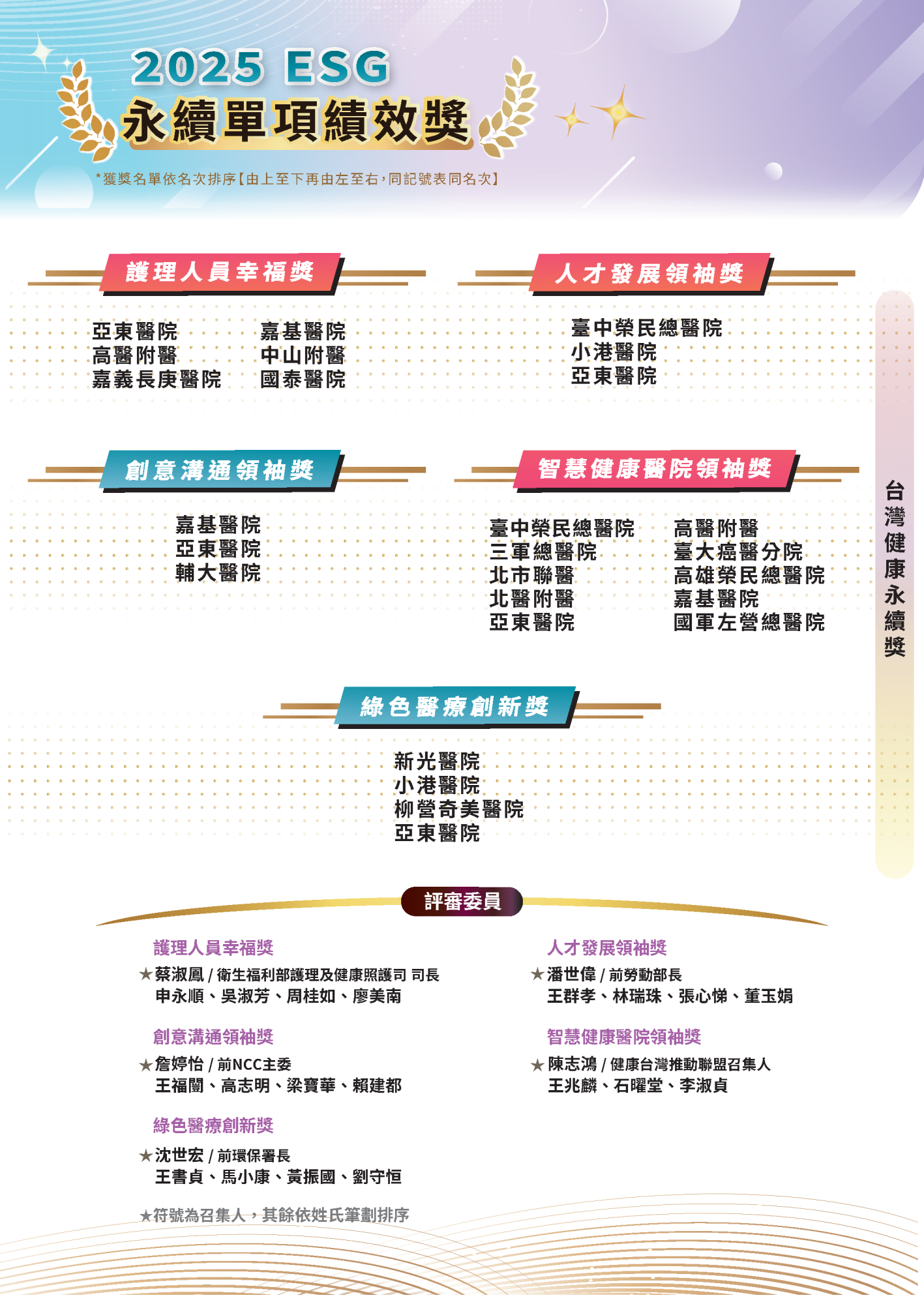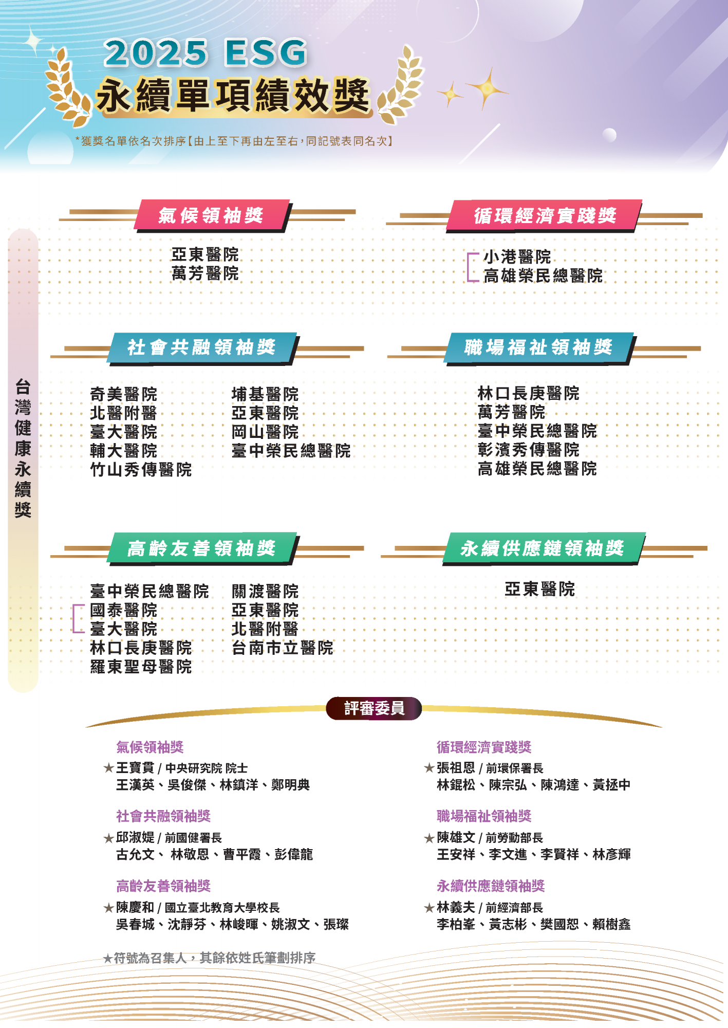 另外,花蓮慈濟醫院、中國醫藥大學附設醫院、衛生福利部雙和醫院(委託臺北醫學大學興建經營)列績優醫院;臺大醫院雲林分院院長馬惠民、馬偕醫院總院長張文瀚則獲得傑出永續人物獎。