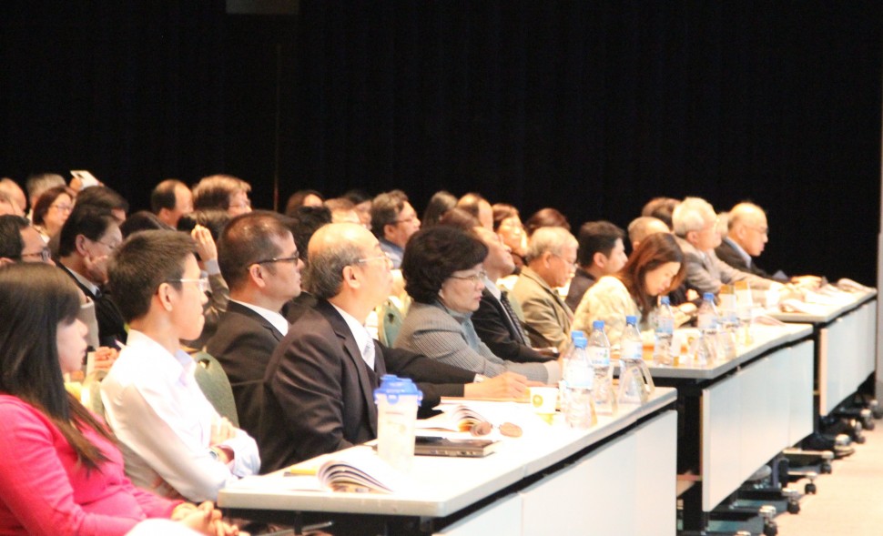 (左圖:簡董事長演講、右圖:台下貴賓及與會者專心聆聽)