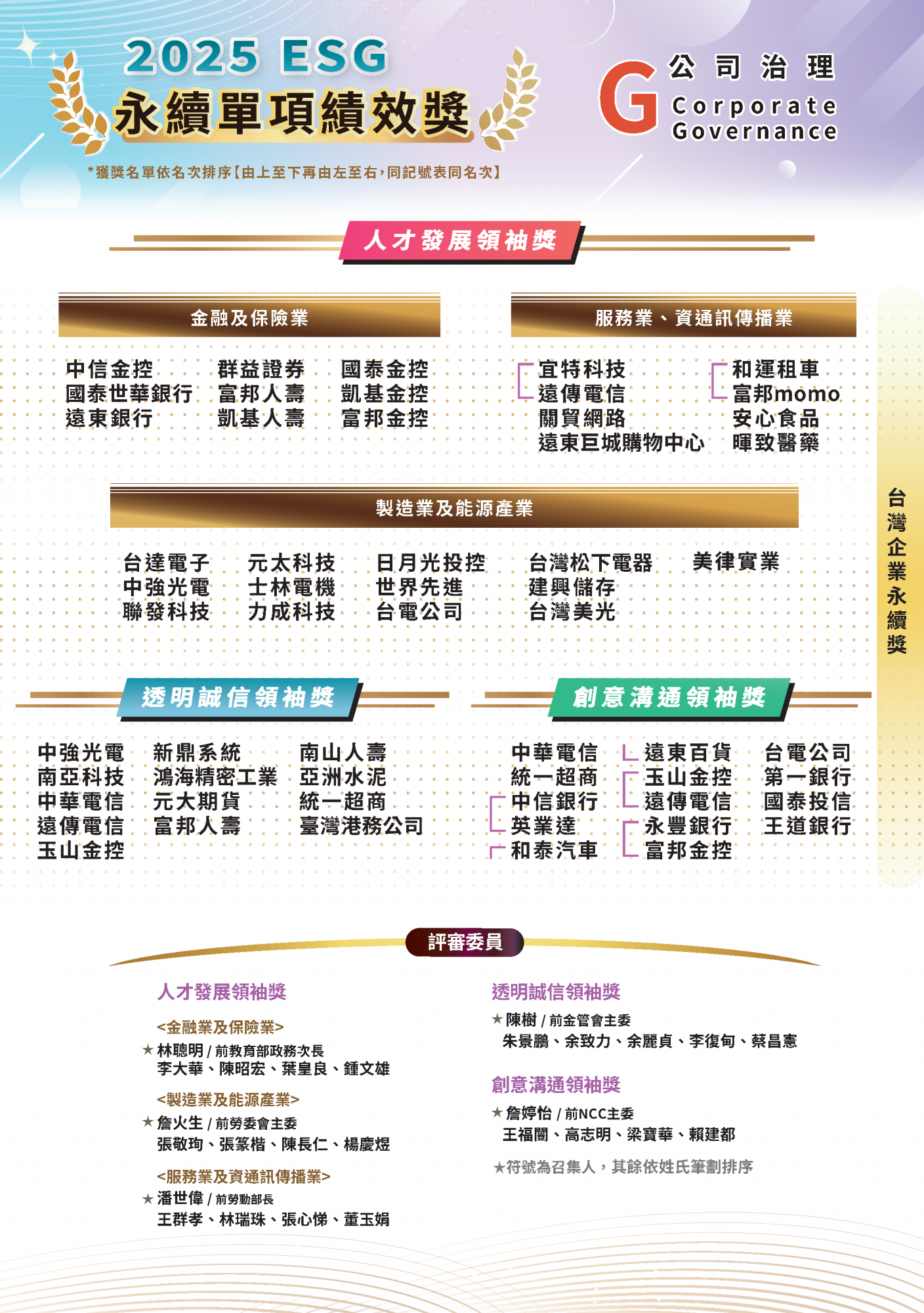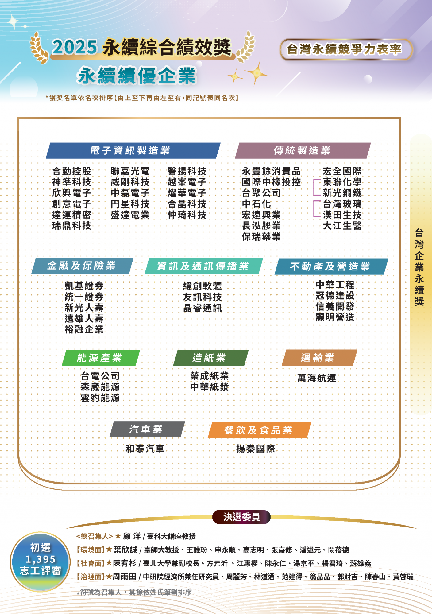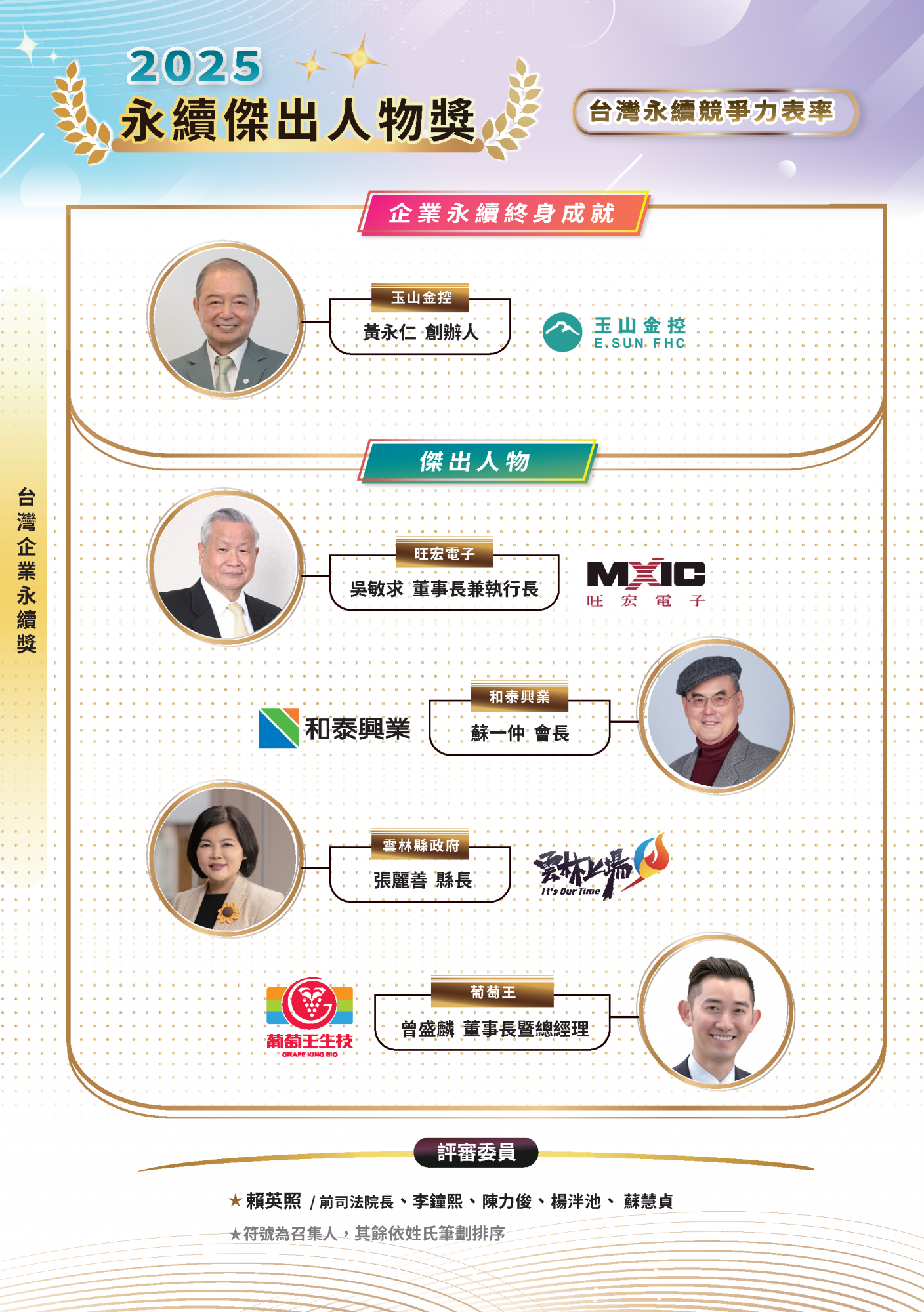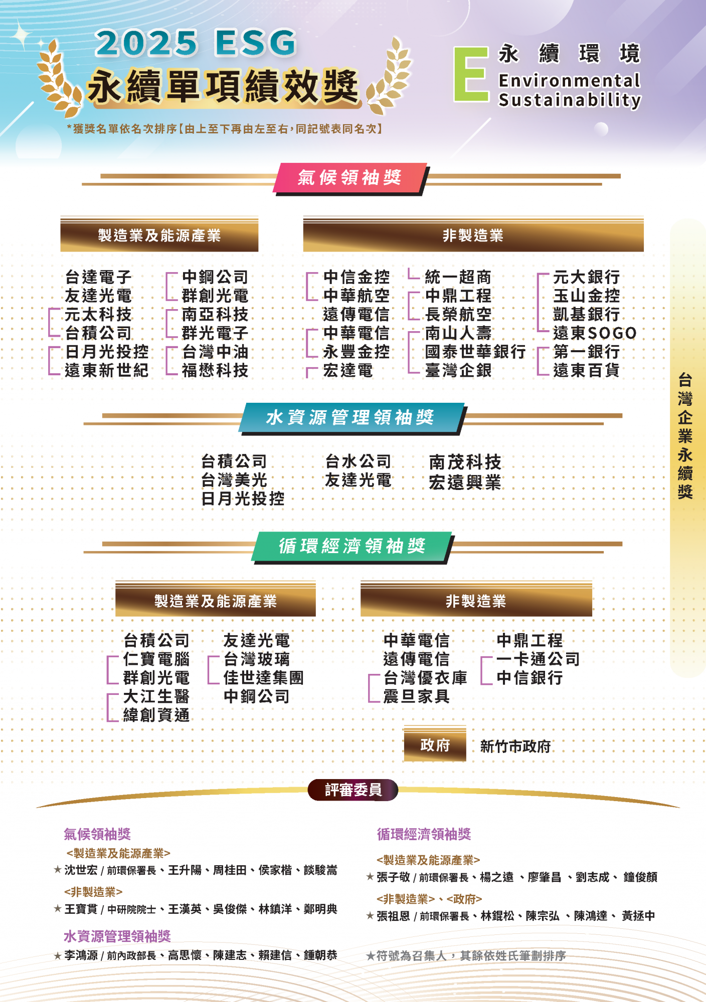 2025.11.15 2025 台灣企業永續獎 榜單揭曉 永續傑出人物 台灣十大永續典範企業 台灣百大永續典範企業 台灣永續績優企業台灣永續典範/績優外商 永續單項績效 永續報告書 永續傑出人物回榜單選項十大永續典範企業回榜單選項台灣百大永續典範企業 回榜單選項台灣永續績優企業回榜單選項台灣永續典範/績優外商回榜單選項永續單項績效 回榜單選項永續報告書回榜單選項