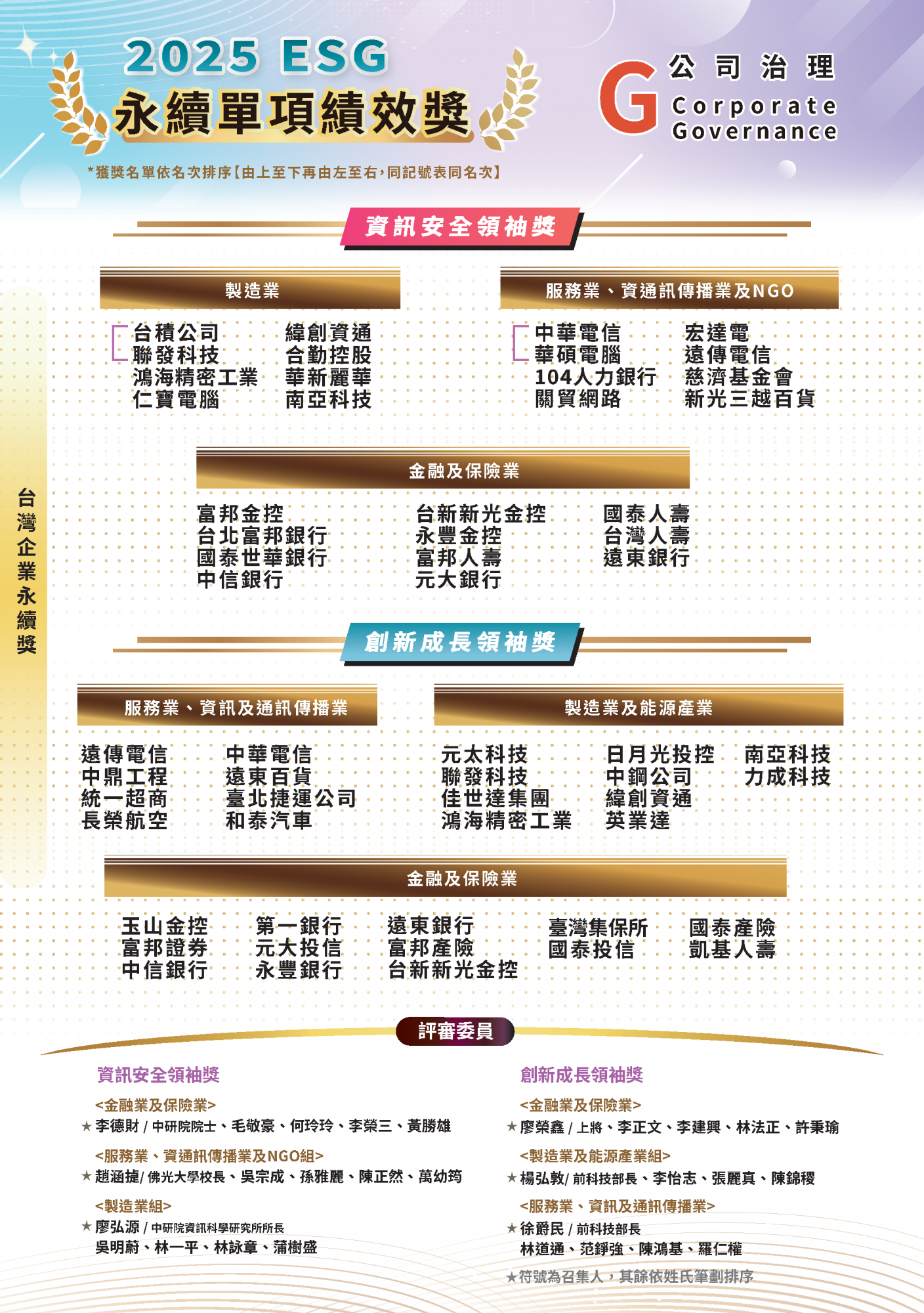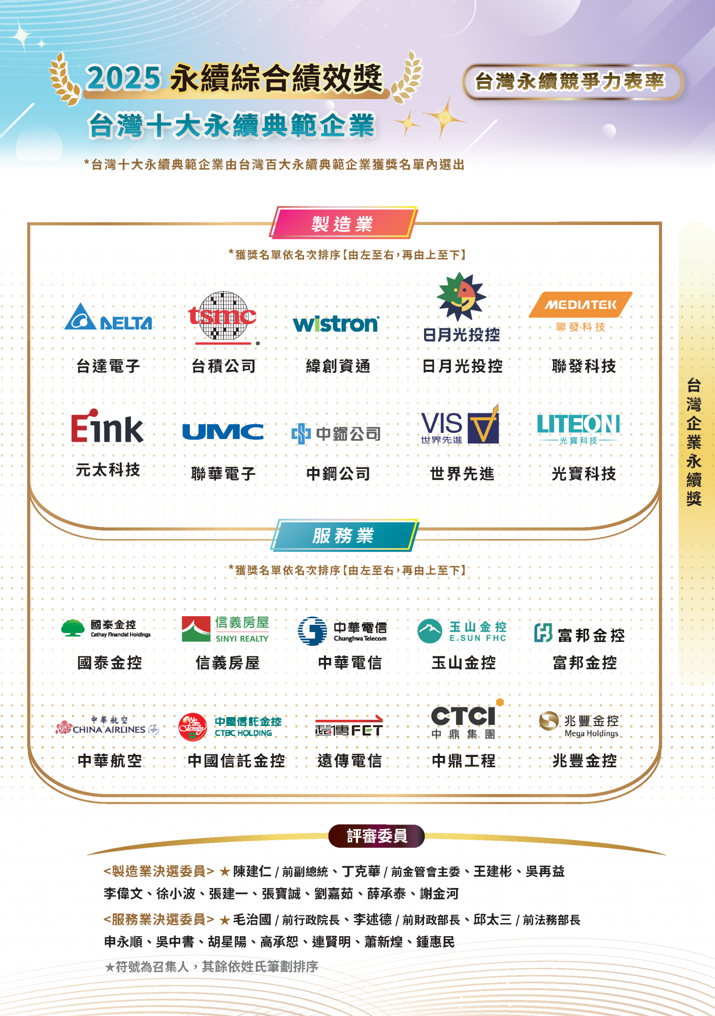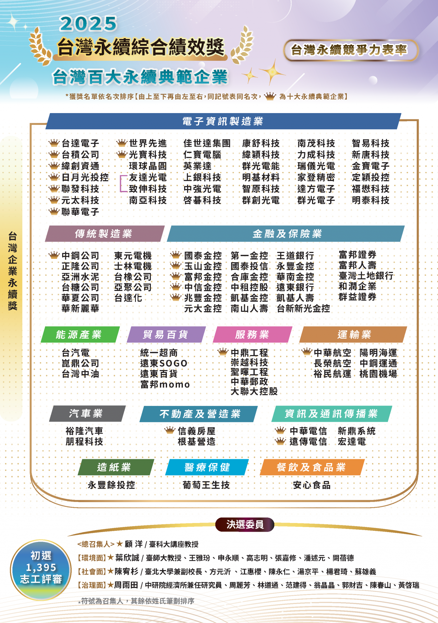 2025.11.15 2025 台灣企業永續獎 榜單揭曉 永續傑出人物 台灣十大永續典範企業 台灣百大永續典範企業 台灣永續績優企業台灣永續典範/績優外商 永續單項績效 永續報告書 永續傑出人物回榜單選項十大永續典範企業回榜單選項台灣百大永續典範企業 回榜單選項台灣永續績優企業回榜單選項台灣永續典範/績優外商回榜單選項永續單項績效 回榜單選項永續報告書回榜單選項