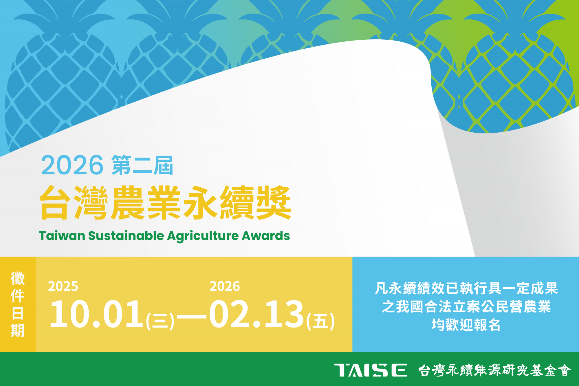 在全球永續轉型的推動下,農業角色正快速重塑,不再只是糧食生產的傳統產業,更是串聯土地治理、社會共融與綠色創新的關鍵平台。台灣永續能源研究基金會(TAISE)宣布,「2026 第二屆台灣農業永續獎」即日起開放徵件,誠摯邀請全台農業機關 (構)、農會、研究單位、產銷組織、企業與民間團體踴躍參與,共同展現台灣在永續浪潮中累積的實踐智慧與未來潛力。